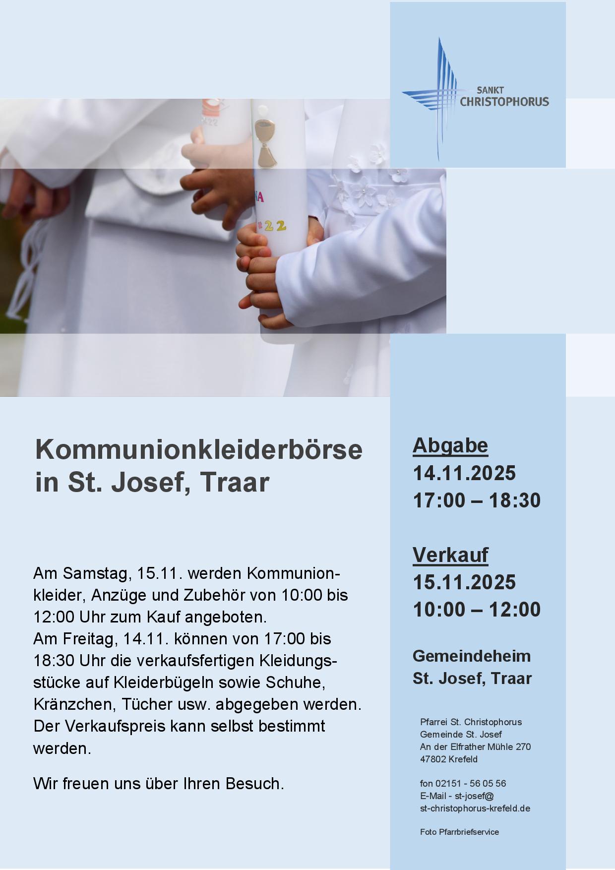 Herzliche Erinnerung an die Kommunionkleiderbörse in St. Josef Traar am Samstag, 16.11.2024 10-12 Uhr.
